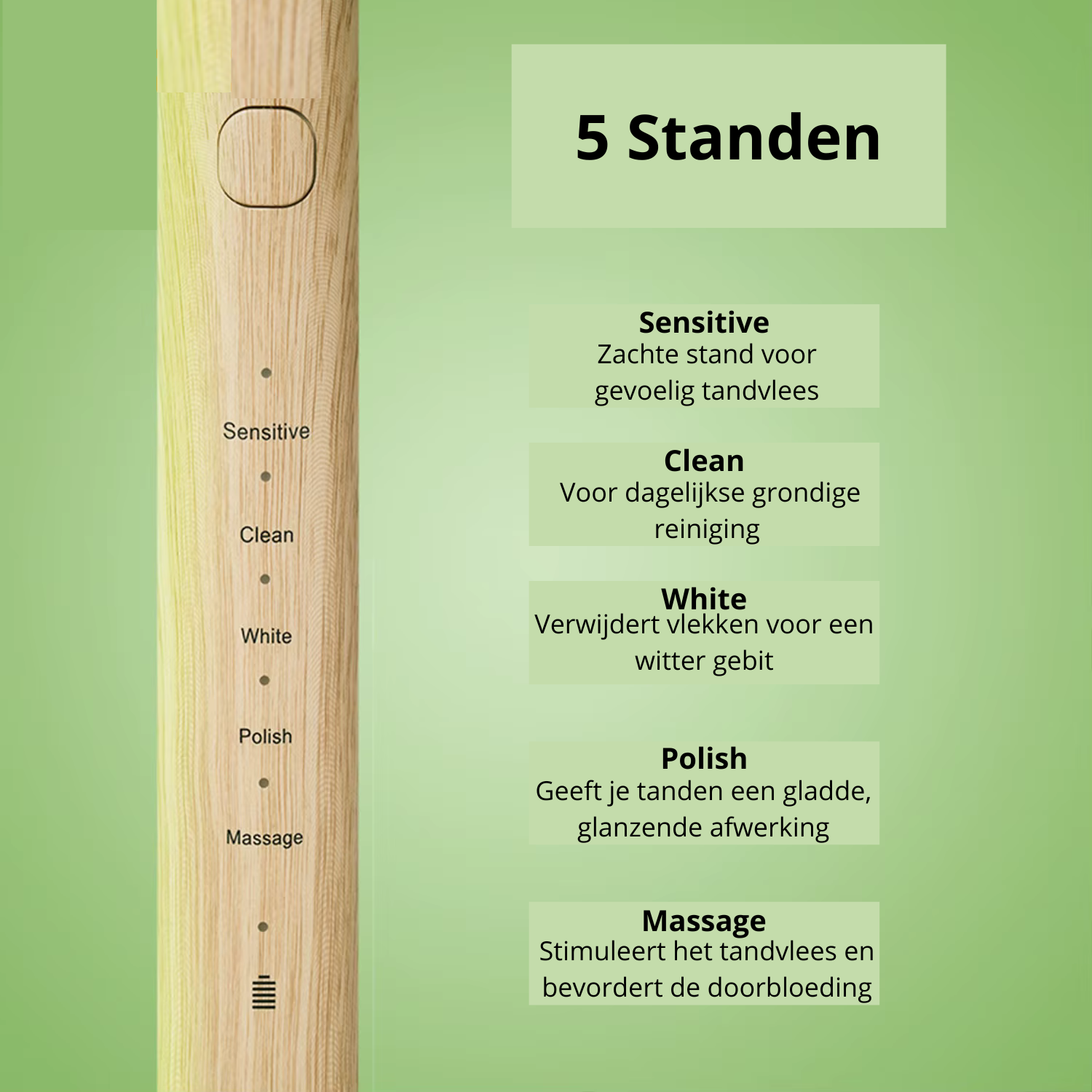 Of je nu last hebt van gevoelige tanden, je glimlach witter wilt maken of gewoon een betrouwbare, krachtige tandenborstel zoekt: dit model past zich aan jouw behoeften aan met vijf geavanceerde poetsstanden. En dankzij het stijlvolle, antibacteriële bamboe handvat geef je je badkamer meteen een natuurlijke en moderne uitstraling.