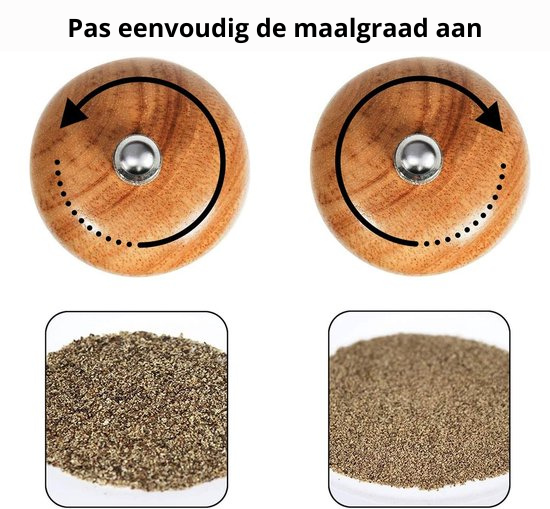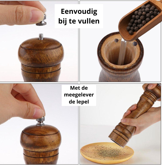 Nooit meer geknoei met bijvullen! Dankzij het slimme ontwerp met een extra groot bijvulgat kun je de molens in een handomdraai vullen. Er wordt bovendien een handige houten lepel meegeleverd, speciaal ontworpen om het vullen nóg gemakkelijker te maken. Zo houd je je werkblad netjes en vul je met precisie.